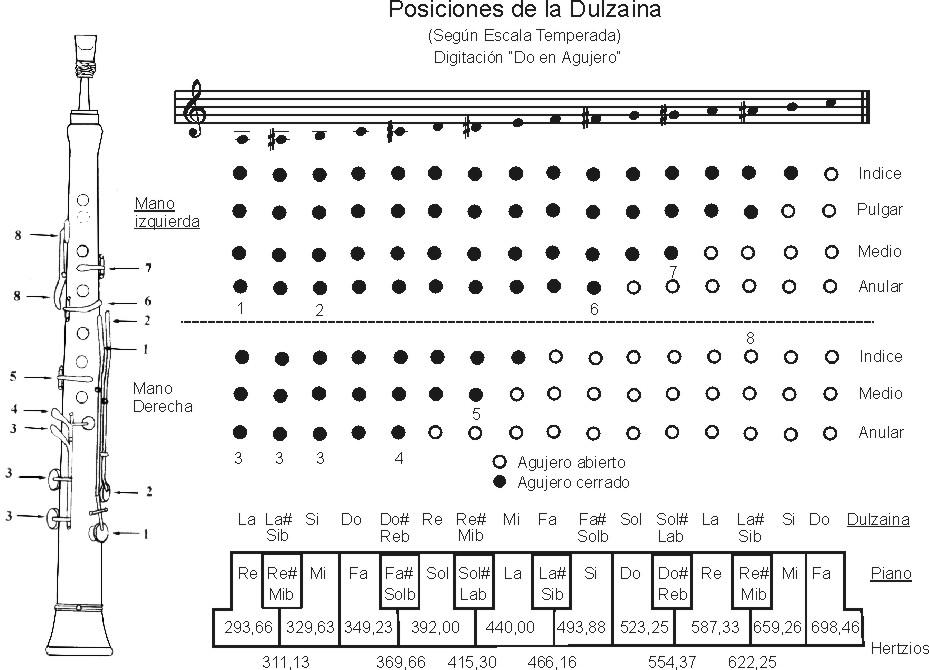 Según estos postulados la Tabla de Posiciones de la dulzaina es la que figura seguidamente. Los puntos negros indican agujeros tapados, los ceros agujeros abiertos y los números las llaves que deben actuarse.