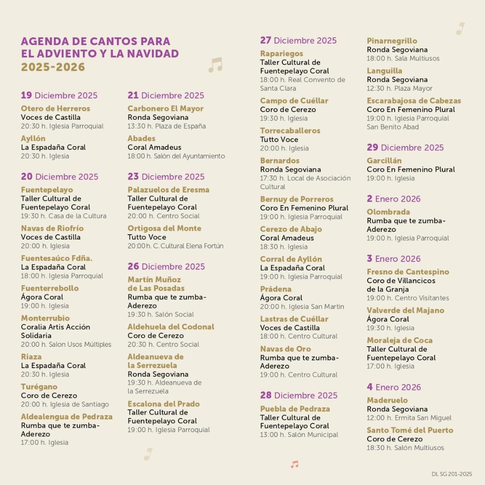Doce agrupaciones vocales de la provincia serán las encargadas de acercar la música polifónica tradicional propias de las fiestas navideñas. Las primeras citas se darán en Otero de Herreros y Ayllón con las formaciones Voces de Castilla y La Espadaña Coral respectivamente, y la última tendrá lugar el 4 de enero en Santo Tomé del Puerto con el Coro de Cerezo.
