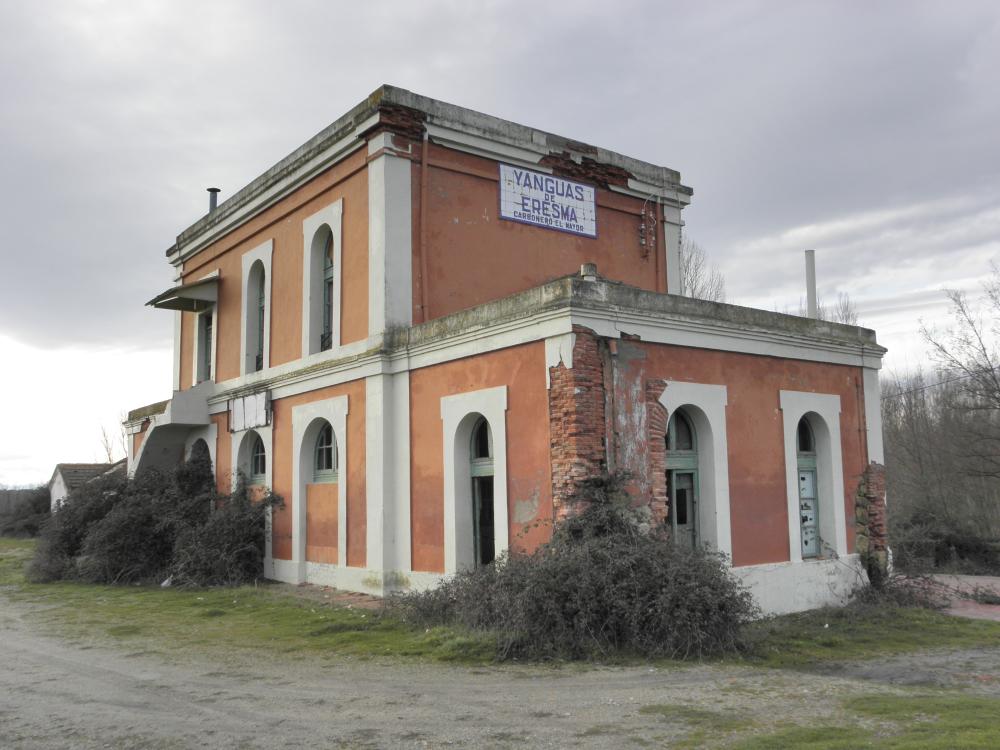 El nacimiento de San Pedro, como barrio de Yanguas de Eresma, está vinculado a la edificación de esta estación de tren vinculada a la línea férrea Segovia - Medina. Esta antigua estación de ferrocarril, construida a principios del siglo XX, se sitúa a algo más de 2.500 m al NO/O del centro urbano de Yanguas. Está compuesta por un edificio principal dividido en dos plantas ( en la planta baja estaban las taquillas, sala de espera y sala de control; en la superior se disponía la vivienda del jefe de estación) y una serie de construcciones anexas (muelle de paquetería, aseos y una cantina). El edificio principal está realizado en fábrica mixta de ladrillo y cajones de adobes encalados. Fue abandonada con la clausura de la línea Segovia-Medina del Campo, septiembre de 1993. En términos generales la estación está un tanto deteriorada, a las puertas de una ruina incipiente.